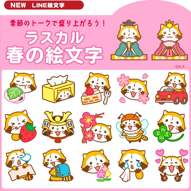 春を感じさせるキュートなラスカルの絵文字が登場!季節のイベントやお祝い、新しい環境でのあいさつなどにピッタリ!ミニスタンプとしても使えるから、とっても便利♪リアクションにも使ってね☆