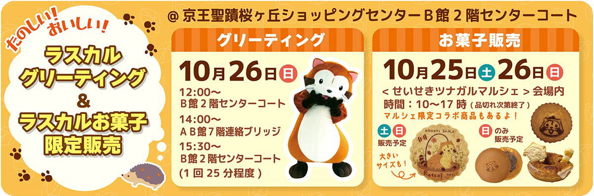 10月26日(土)には、聖蹟桜ヶ丘ショッピングセンターB館2階 センターコートにて、ラスカルのグリーティングと限定お菓子販売を開催いたします。
