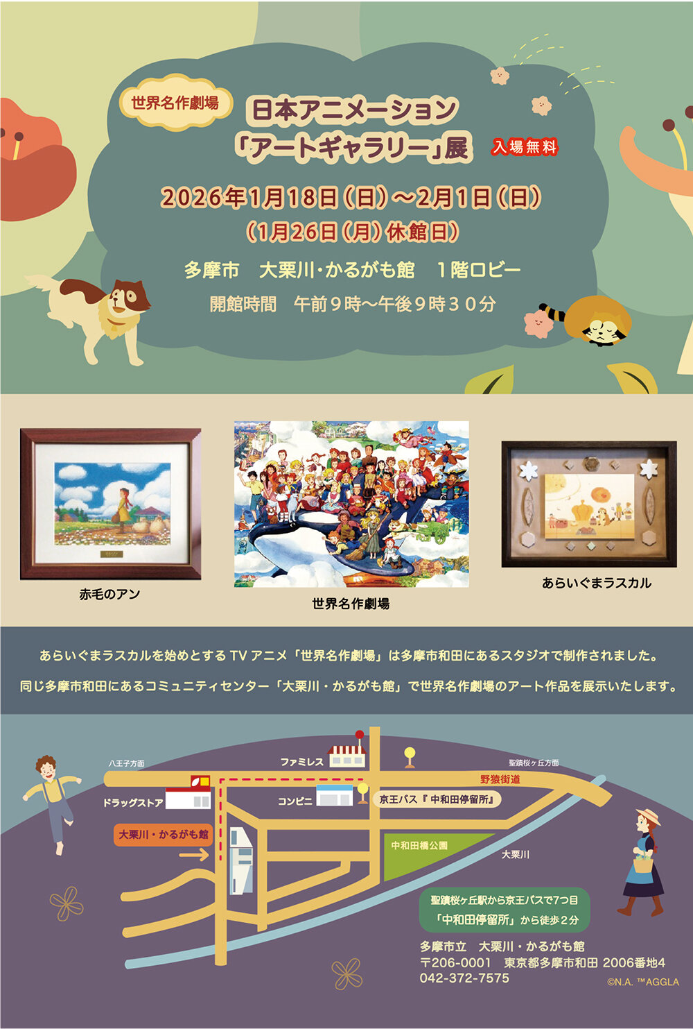 少しでも地域に貢献出来ればと、多摩市立和田・東寺方コミュニティセンターにて、日本アニメーション「アートギャラリー」展を開催いたします。
